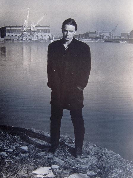U2's Bono photographed on the docks in Dublin - his "favourite place" - in winter 1987.