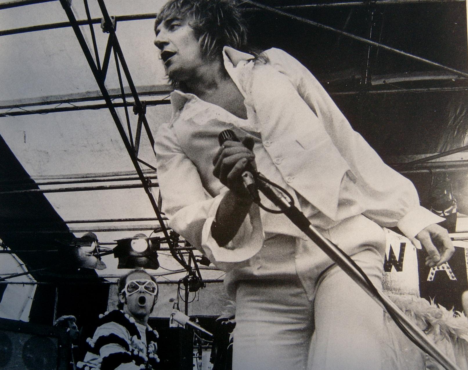 Elton John and Rod Stewart, setting the terraces swaying at Watford Football Ground, May 1974.