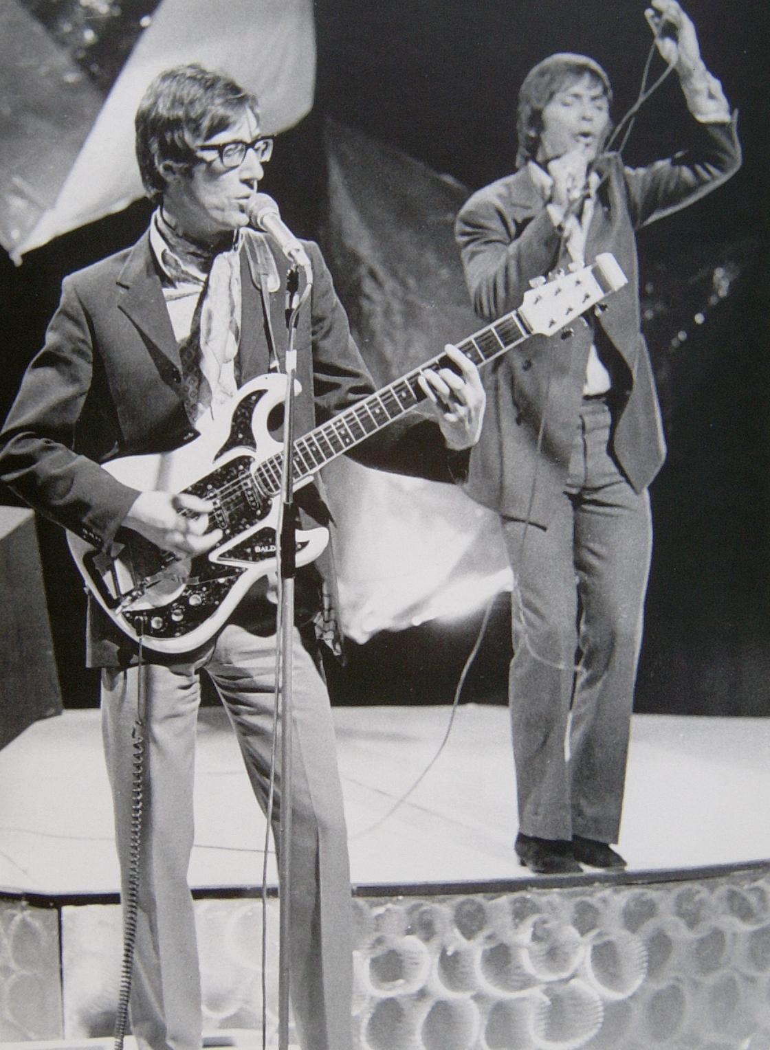 Hank Marvin plays while Cliff gets wild, for Top Of The Pops in September, 1969.