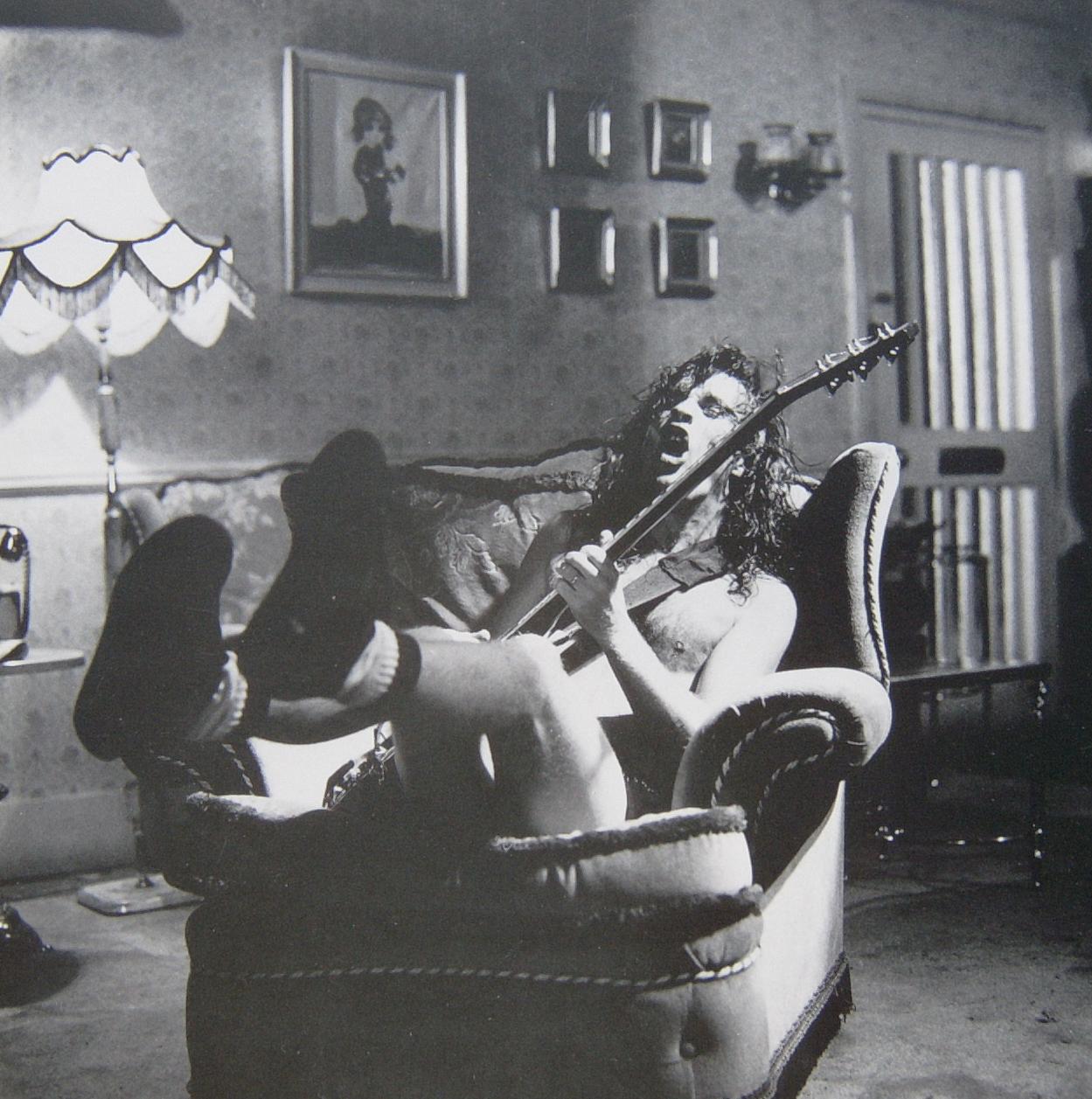 Angus Young of AC/DC, thoroughly relaxed between takes on a video shoot in Battersea, London.