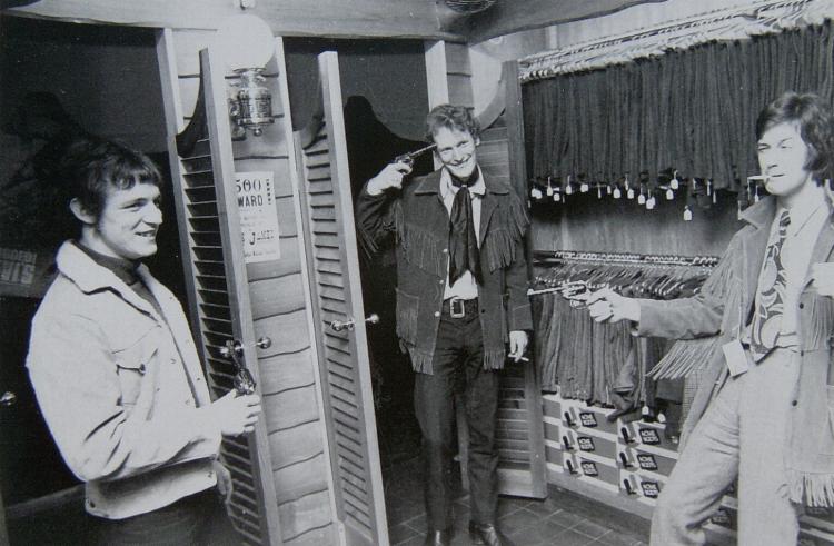 Cream's Jack Bruce, Ginger Baker and Eric Clapton engage in zany pranks at a Swinging London haberdasher's, 1967.