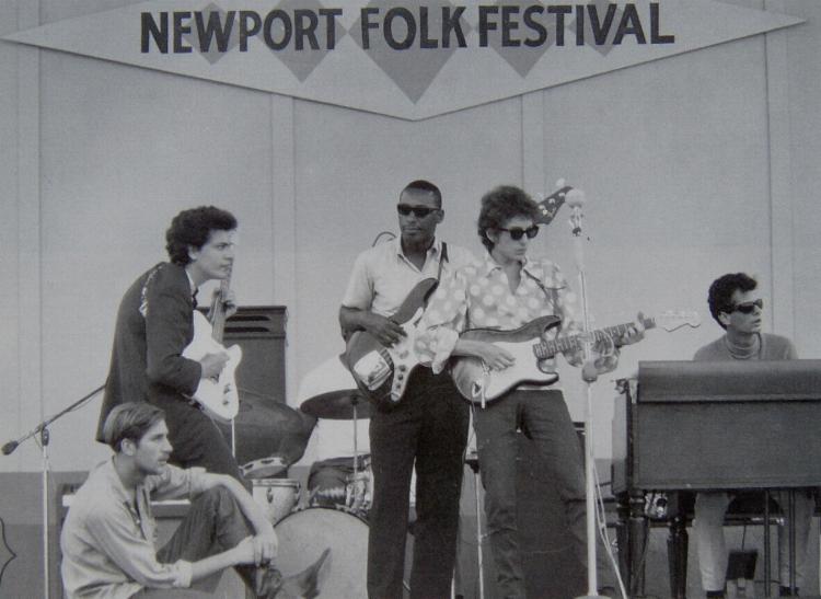 Soundchecking with members of the Paul Butterfield Band at the Newport Folk Festival in 1965, his first "electric" appearance. To the left on guitar is Mike Bloomfield; Al Kooper is on keyboards. |