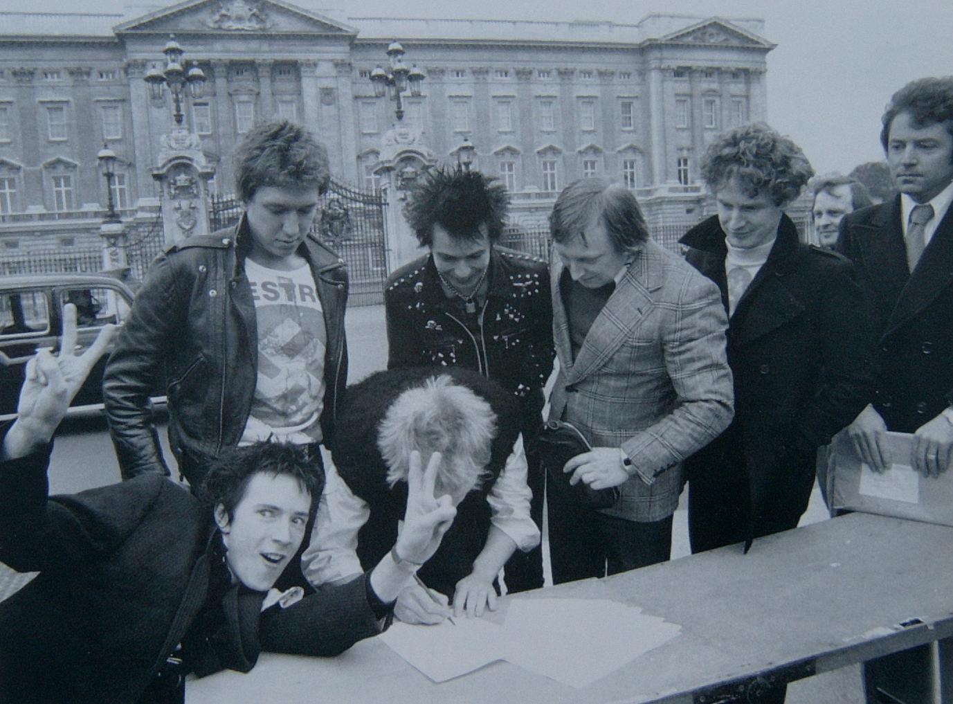 Supervised by publicity-shy supremo Malcolm McLaren, The Sex Pistols sign a recording contract for A&M outside Buckingham Palace, March '77. A week later they'd be kicked off the label.