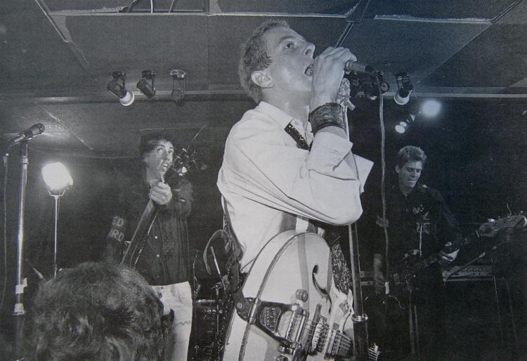 The Clash's Joe Strummer mounts another hoarse assault on Babylon, 1977, with writing partner Mick Jones (left) and bassist Paul Simonon (right). Their set took in such righteous blasts as London's Burning, White Riot and English Civil War. |