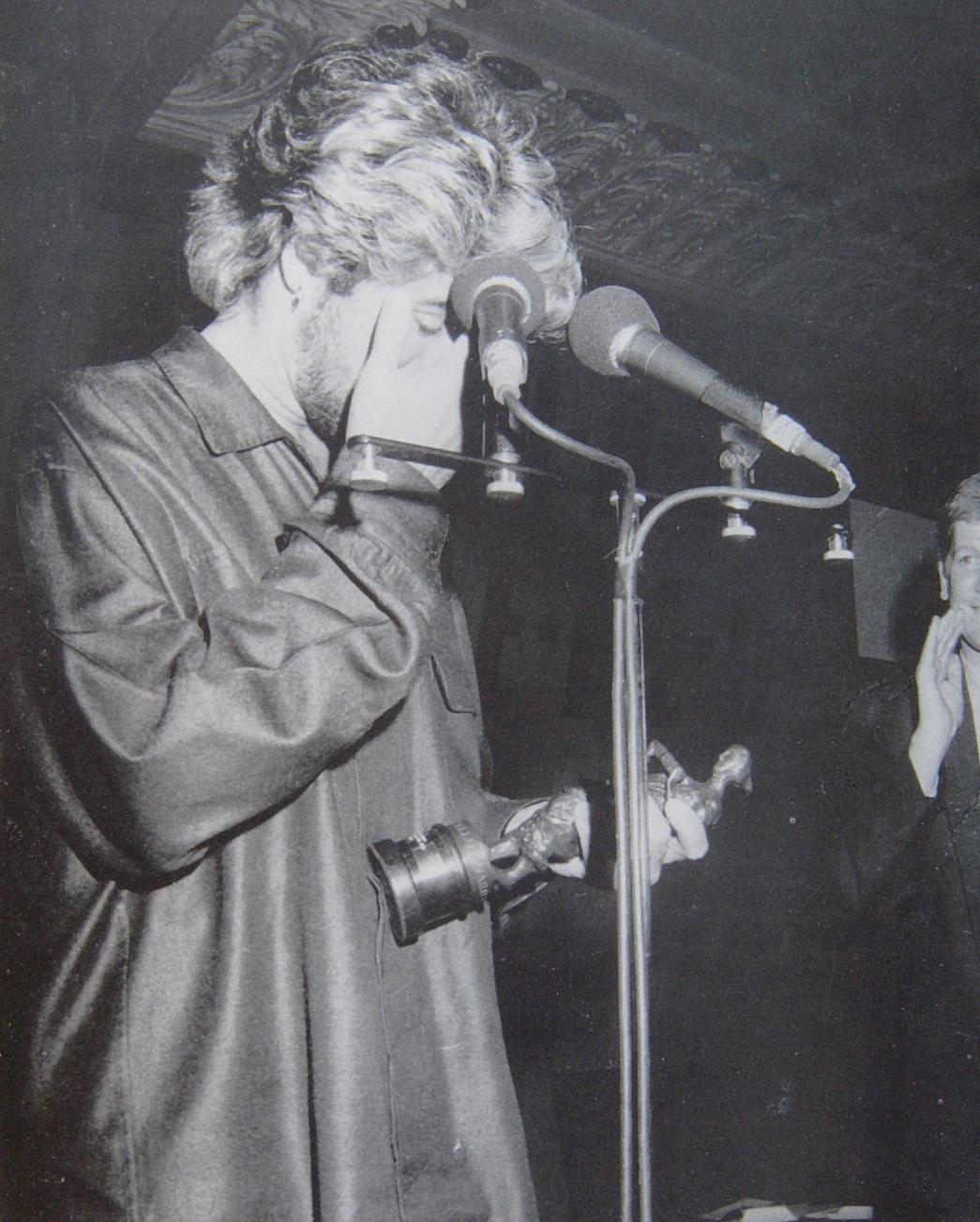 Just a little overcome with emotion, 21-year-old George Michael becomes the youngest recipient of an Ivor Novello songwriting award in London, 1985. Presenting it, Elton John had hailed him as "a major songwriter in the tradition of Paul McCartney and Barry Gibb". |